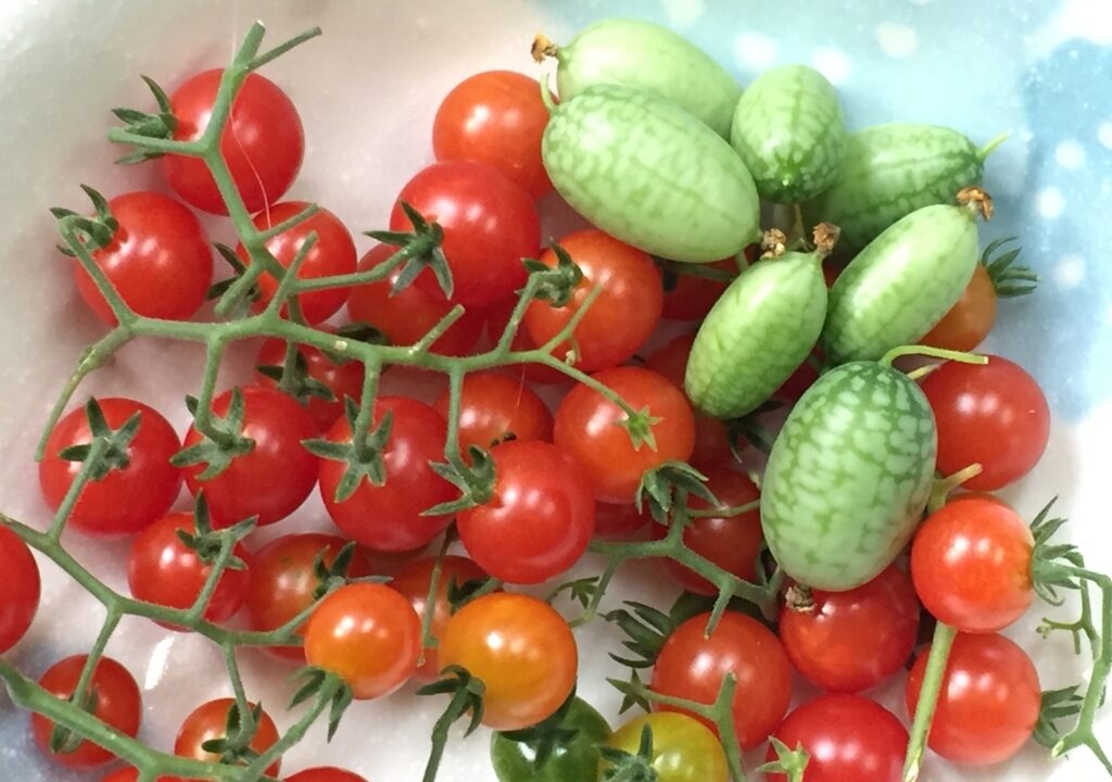 プランターのマイクロトマトと小さいキュウリプチキューを